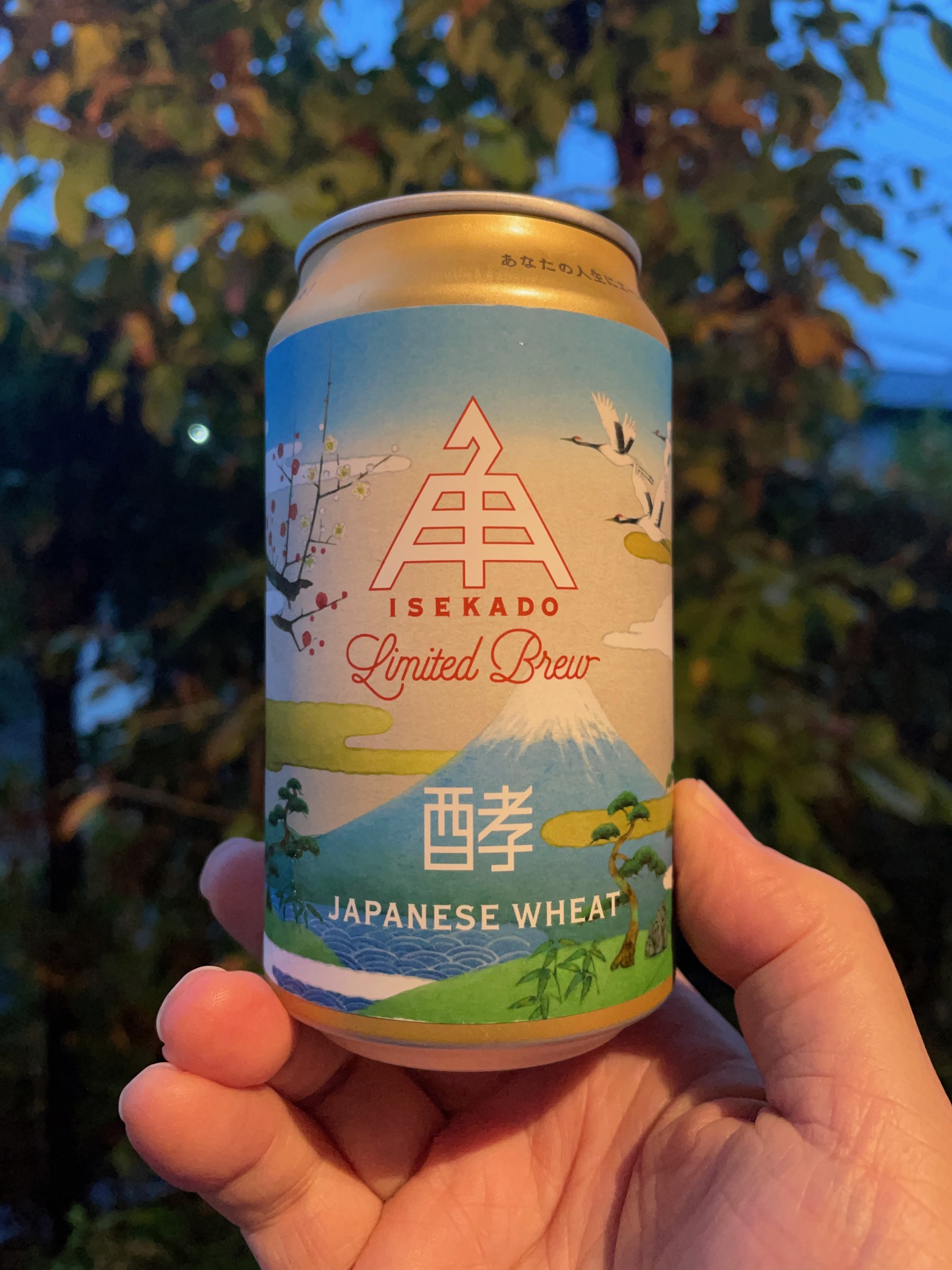 淡い青と金を基調に、富士山、松、鶴、梅といった日本的なモチーフが描かれ、まるで浮世絵のような上品な佇まいです。「ISEKADO Limited Brew」というロゴも高級感があり、手に取る瞬間から特別感を演出します。