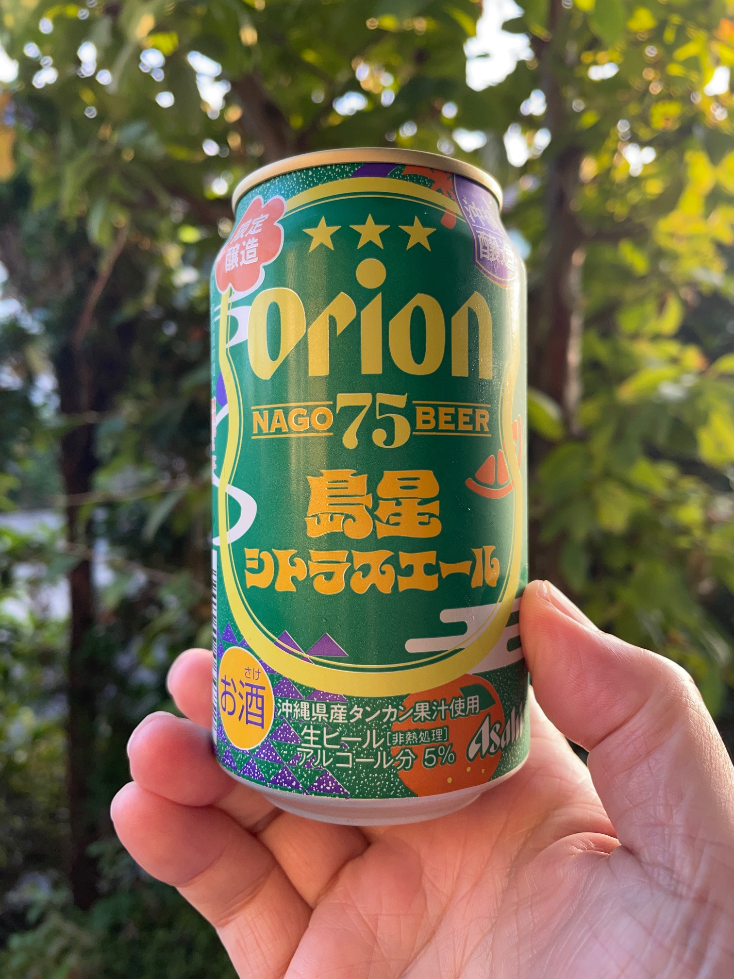 缶のデザインは、南国沖縄らしい鮮やかなグリーンとゴールドを基調としたポップな雰囲気。中央には「Orion」のロゴと「NAGO75 BEER」の文字が大きく配置され、視覚的にもインパクトがあります。さらに「島星シトラスエール」という名前からも、沖縄の自然や夜空のきらめきを連想させ、旅行のお土産や贈り物にもぴったりです。